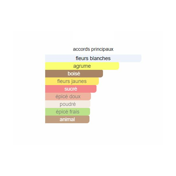 La note de tête est Bergamote; les notes de cœur sont Ylang-ylang, Lys de Casablanca et Fleur d’oranger; les notes de fond sont Ambre, Bois de santal et Vanille de Tahiti.