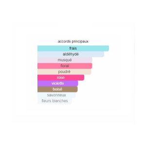 Les notes de tête sont Aldéhydes, Rose et Poivre rose; les notes de coeur sont Pivoine, Violette et Fleur d’oranger d’Afrique; les notes de fond sont Musc, Notes boisées et Bois de santal.