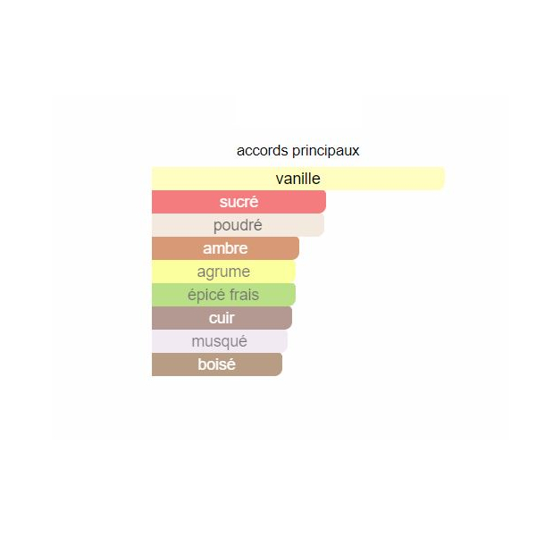 Les notes de tête sont Mandarine verte et Pomme; les notes de cœur sont Fleur d’oranger, Noix de muscade et Graines de carotte; les notes de fond sont Daim, Fève de tonka, Vanille et Notes boisées.