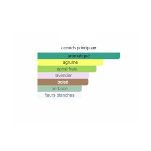 Les notes de tête sont Lavande, Mandarine, Bergamote et Citron; les notes de cœur sont Coriandre, Lys, Fleur d’oranger, Baies de genévrier, Basilic, Jasmin, Sauge, Muguet et Géranium; les notes de fond sont Bois de santal, Ambre, Musc, Vétiver et Palissandre du Brésil.