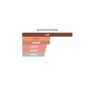 Les notes de tête sont Safran, Framboise et Thym; les notes de cœur sont Résine oliban et Jasmin; les notes de fond sont Cuir, Daim, Ambre et Notes boisées.