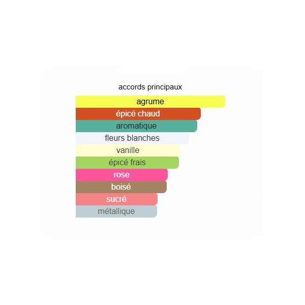 Les notes de tête sont Bigarade, Coriandre, Mandarine et Bergamote; les notes de coeur sont Safran, Géranium, Fleur d’oranger, Rose et Jasmin Sambac; les notes de fond sont Notes boisées, Vanille et Fève de tonka.